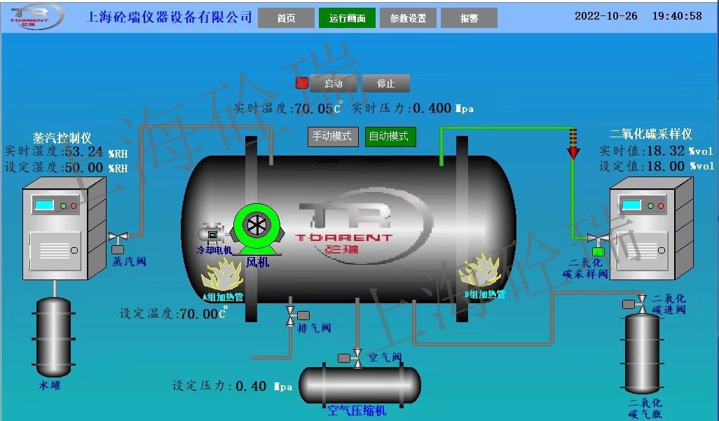 4.電氣自動(dòng)控制系統(tǒng)含自動(dòng)進(jìn)蒸汽流量閥、自動(dòng)進(jìn)CO2流量閥、自動(dòng)排氣泄壓閥、電磁閥、氣路、溫度傳感器、濕度傳感器、壓力傳感器、CO2濃度傳感器、電器控制箱、空氣壓縮機(jī)、CO2減壓閥、降溫水冷系統(tǒng)等配件